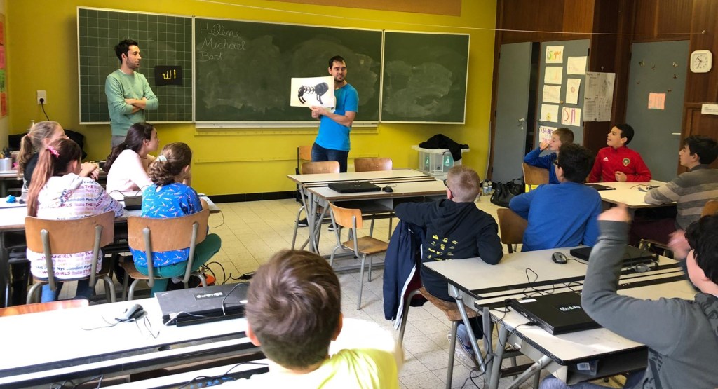 Different volunteers (myself included) give 2 workshops in a classroom. Our team consists of 3 people from the IT-sector (2x Colruyt Group and 1x PwC).