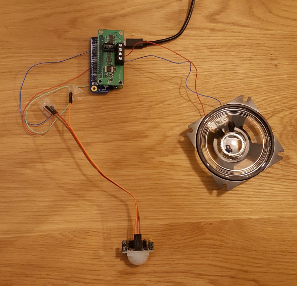 - A HiFiBerry MiniAMP (bottom middle) to play sound