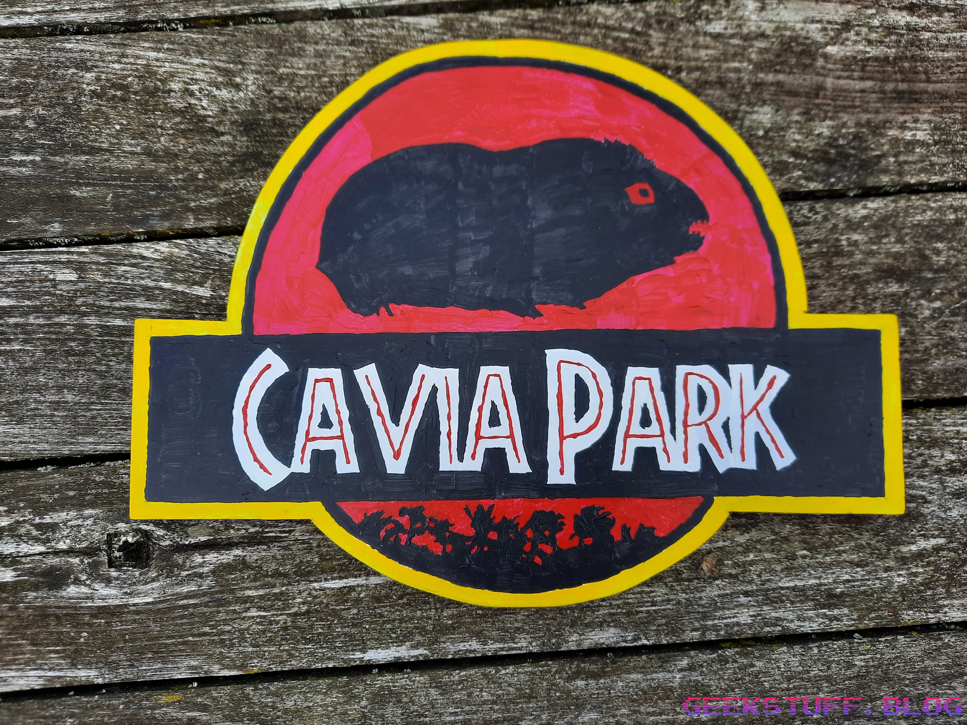 It’s time to give my Guinea Pigs (“Cavia” in Dutch) an upgrade! So they get their own “Cavia Park” sign, inspired by Jurassic Park. I picked up the idea for this while browsing the internet, when I suddenly stumbled upon a “Chicken Park” sign.