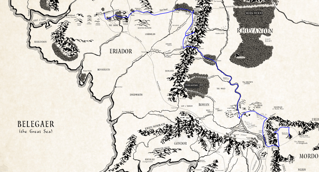 The site LOTRproject has a really nice map of Frodo’s journey. But what I’m really looking for is a way to track the real distance I walk towards Mordor.