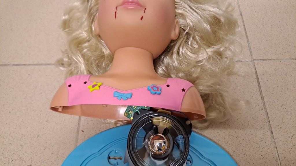 I opened it, and placed a Raspberry Pi inside. The Pi has the voice bonnet addon and a speaker. It will play creepy noises at regular times: “Hi, I´m Annabelle”, “Do you want to play with me?“, or some creepy laughter.