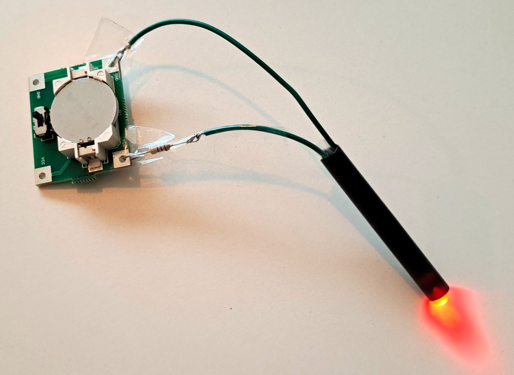 As you can see, I definitely need to invest in a proper soldering iron — for now, I just used plastic tape to hold things together. The LED sits inside a plastic straw, making it easy to position inside the pumpkin.