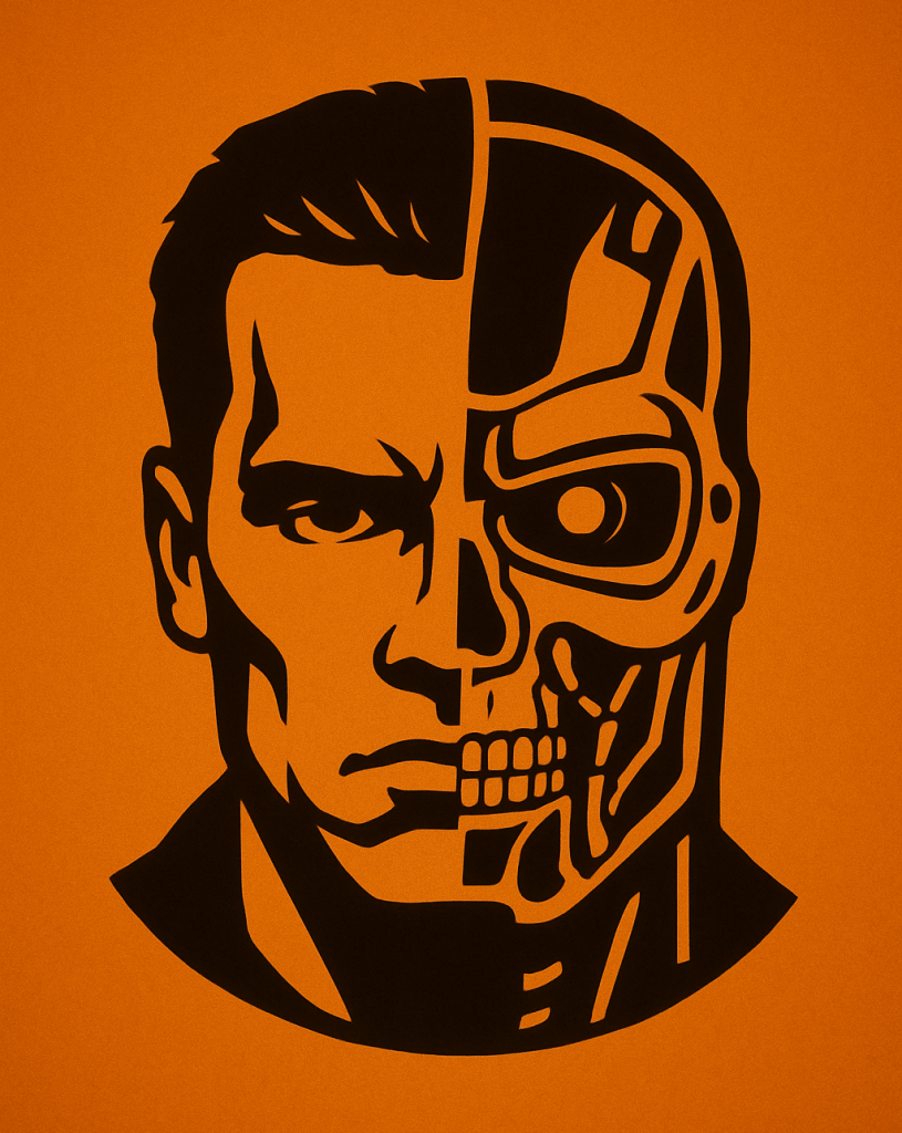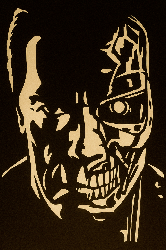Variant 1: Generate a pumpkin stencil image of the terminator. I want one half to be human, and the other half cyborg